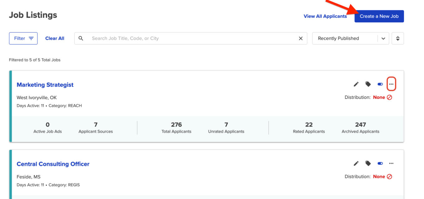 1. Click on the Create a New Job button or if you're wanting to hide an existing job, click on the 3 dots circled below and select Edit Job to hide an existing job.