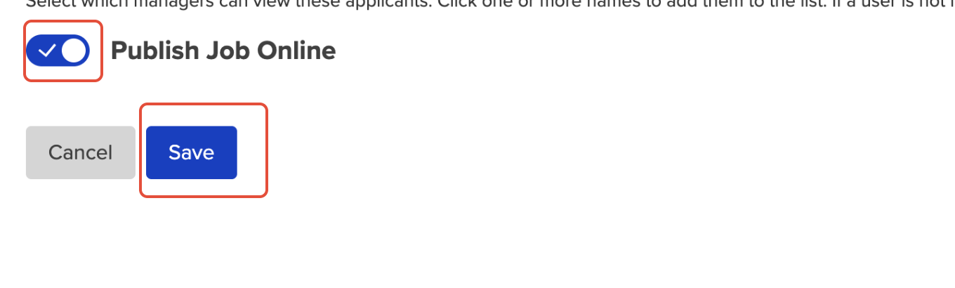 4. Then scroll to the bottom of the page, make sure your toggle to publish the job online is enabled and click on Save. Now your job posting will remain hidden and will be indicated in your Dashboard by a